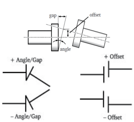با توجه به شکل زیر نا هم محور در سه پارامتر یا مشخصه قابل تشخیص و اندازه گیری استgap offset angelبراین اساس هر یک از مشخصه های فوق دارای مقادیر مثبت منفی می تواند باشد .