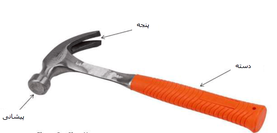 دارای یک سر فولادی و یک دسته از جنس چوب، فولاد یا فایبرگلاس (نگاه کنید به شکل زیر). سر از چکش برای کوبیدن میخ ها و گوه ها استفاده می شود. پنجه برای کشیدن میخ از قطعه کار استفاده می شود. بخش پیشانی چکش می تواند صاف یا گرد باشد.
