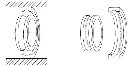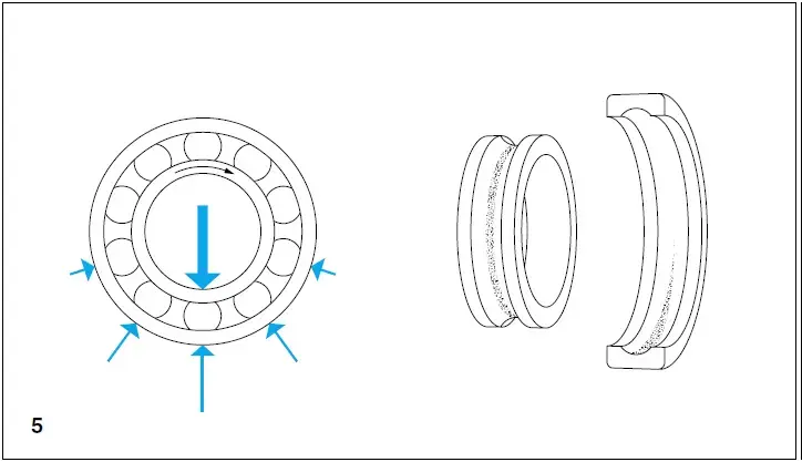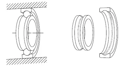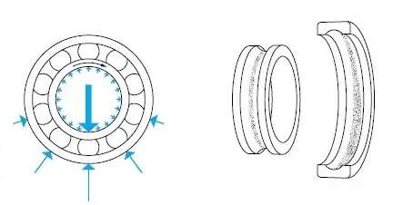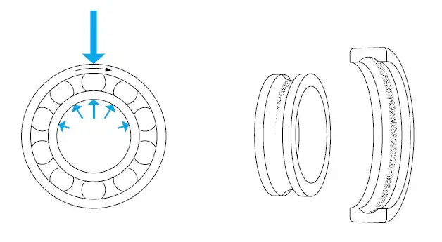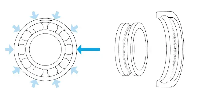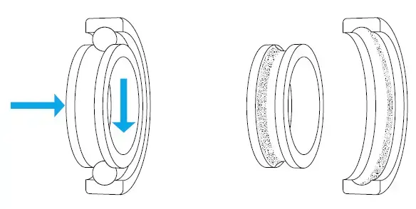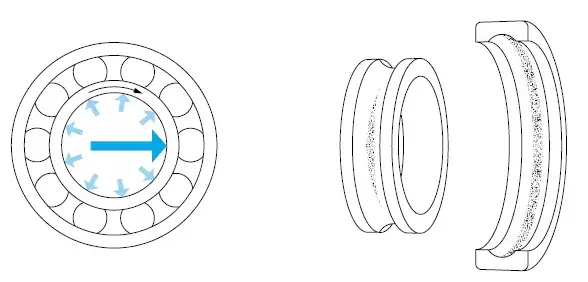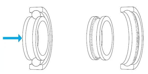 - واشر شفت و واشر: الگوی مسیریکنواخت در عرض، گسترده در اطراف محدوده کل مسیرهای هر دو واشر ترکیبی از بارهای یک طرفه شعاعی و محوری چرخش حلقه درونی-حلقه بیرونی ثابت