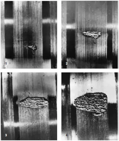 پس از گذشت زمان، این تنش ها باعث ایجاد ترک هایی می شود که به تدریج به سطح گسترش می یابد. این وضعیت برای قطعاتی که روی سطوحی در حال غلتیدن هستند سبب افزایش تعداد ترک ها شده و موجب شکستن عناصر غلتان و جدا شدن قطعات ترک خورده از مواد این قطعات شده و باعث خرد کردن یا پوسته پوسته شدن می شود. این پوسته پوسته شدن به تدریج افزایش می یابد.