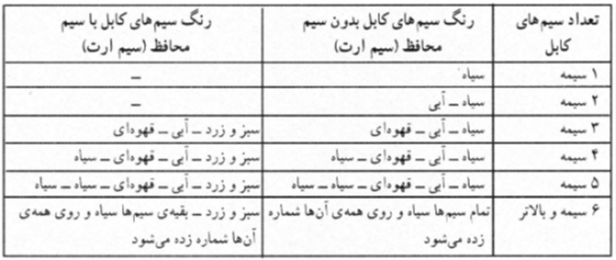 در جدول زیر رنگ برخی از سیم ها بر اساس استانداردVDE0271آلمان و موسسه استاندارد و تحقیقات صنعتی ایران داده شده است: