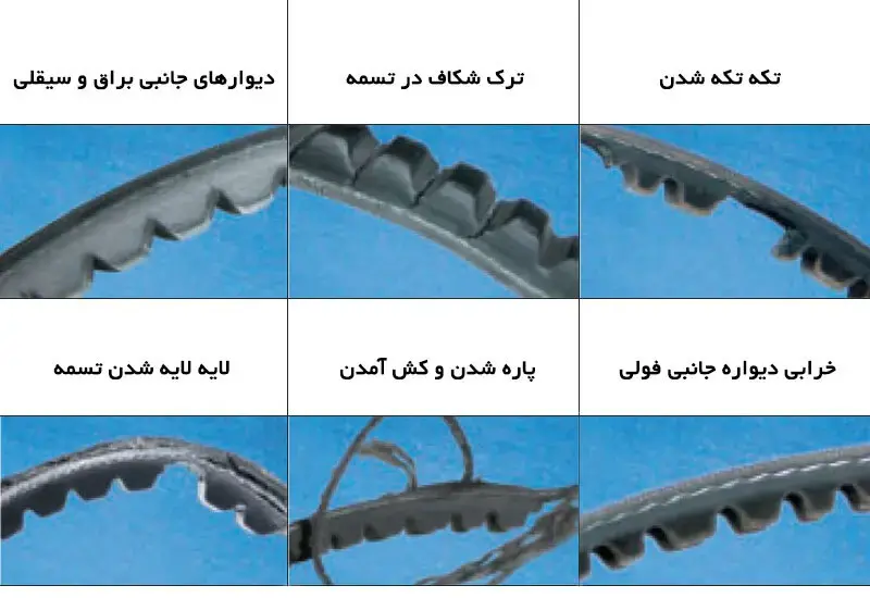 تسمه هایی که شکاف های عمیق در لایه های زیرین و فواصل منظم ظاهر می شوند، ناشی از چرخش تسمه حول یک فولی بیش اندازه کوچک ایجاد می شود. وجود ترک ها و شکاف های کوچکتر نشان دهنده زمان کارکرد طولانی یا پایان عمر کاری تسمه است.