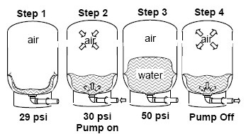همانگونهکهدراینشکلبالامشخصاستقسمتفوقانیمخزنباهواییفشردهانباشتهشده.آب مصرفیتوسطیکلولهازسیستمپمپاژوارد تیوب لاستیکیمخزنشدهوباعث افزایش حجم تیوب و از طرفی موجب کاهش حجم بخش خالی از آّب مخزن که از هوای فشردهپر شده می شود و این مساوی خواهد بود با افزایش فشار هوا در این بخش این افزایش فشار توسط تیوب لاستیکی یا همان دیافراگم به آب داخل دیافراگم اعمال شده و فشار آب محبوس در دیافراگم را افزایش می دهد. تا زمانی که پمپاژ ادامه دارد این فشار رو به افزایش است با قراردادن یک کلید عمل کننده با فشار و تنظیم آن روی عددی مشخص با رسیدن فشار به حد مشخص تنظیم شده پمپ از مدار خارج شده و افزایش فشار متوقف می شود. با شروع مصرف آب از سیستم آب ذخیره شده در مخزن به دلیل بالا بودن فشار شروع به خروج از مخزن کرده و کاهش فشار را جبران می کند این خروج آب از مخزن تا زمانی که محدوده پایینی تنظم کلید عمل کننده با فشار عبور نکند ادامه خواهد یافت در پس از کلید عمل کرده مجددا پمپ وارد مدار می شود و کاهش فشار ناشی از مصرف آب را جبران می کند .