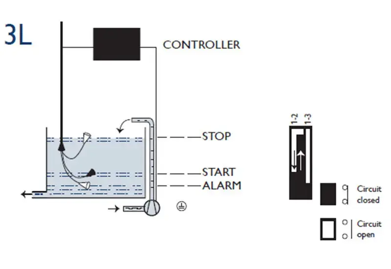 نوع دیگر از شناور و شکل اتصالات آن بر اساس نوع کلید با توجه به رنگ سیم های آن برای دو کاربرد عمده پر کردن و خالی کردن مخزن نشان داده شده است.