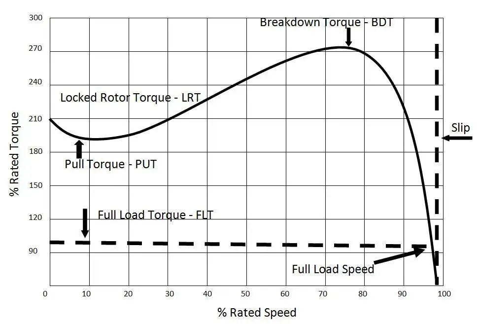 با مشاهده دقیقتر منحنی بالا در می یابیم که با افزایش سرعت از حالت سکون locked rortor torque به نقطه نرمال در ابتدا سرعت صفر گشتاور بالا بوده و به تدریج با افزایش سرعت ، گشتاور کاهش می یابد و پس از کمی افزایش سرعت این گشتاور مجددا شروع به افزایش می کند تا به نقطه Breakdown Torque و ماکزیمم گشتاور برسد و از آنجا شروع به کاهش کرده تا به نقطه کار نرمال یا نمای خود می رسد .