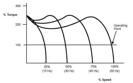 جهت تغییر فرکانس ، تغییر ولتاژ نیز باید مورد توجه قرار گیرد چه با کاهش فرکانس ، امپدانس سیم پیچهای موتور تغییر نموده و کاهش پیدا می کند اگر با کاهش فرکانس سطح ولتاژ کاهش پیدا نکند شار مغناطیسی به حدی افزایش پیدا می کند که موتور را به حالت اشباع می برد و موجب صدمه می شود . از سوی دیگر اگر فرکانس بیش از حد نرمال افزایش یابد ، ولتاژ بالاتری برای تامین ماکزیمم شار مورد نیاز است و این عملا روی نمی دهد زیرا با افزایش سرعت گشتاور Torque کاهش پیدا می کند. بنابراین برای کنترل دور ، علاوه بر فرکانس باید سطح ولتاژ نیز باید تحت کنترل واقع شود. در موتور های القایی نمودار سرعت و گشتاور مطابق شکل زیر است.