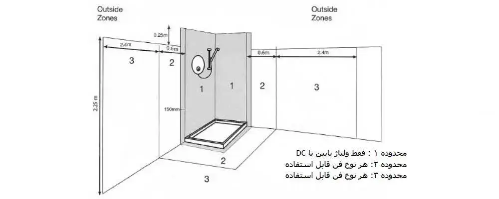 به عنوان مثال یک فن به طور مستقیم بر روی یک حمام یا دوش باید در صورتی که کمتر از 2.25 متر از کف قرار می گیرد بایستی از یک فن با ولتاژ پایین و ترجیحا از ولتاژDCاستفاده نمود .